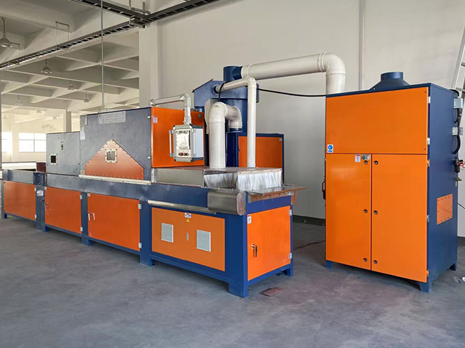喷洗室由环带输送机构成,内部铺设橡皮并设加湿除静电装置,可减少粉尘附着并延长砂材寿命。